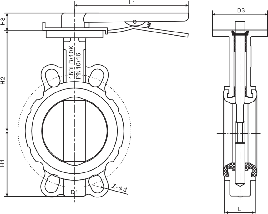 | Nominal Diameter (DN, mm) | L | L1 | D1 | PN1.0Z-φd | PN1.6Z-φd | 150LbZ-φd | 10KZ-φd | D3(Model No.) | H2 | H3 |